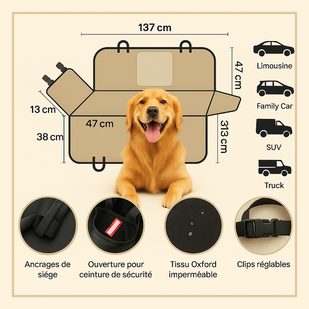 Housse de siège auto imperméable et anti-rayures pour chien